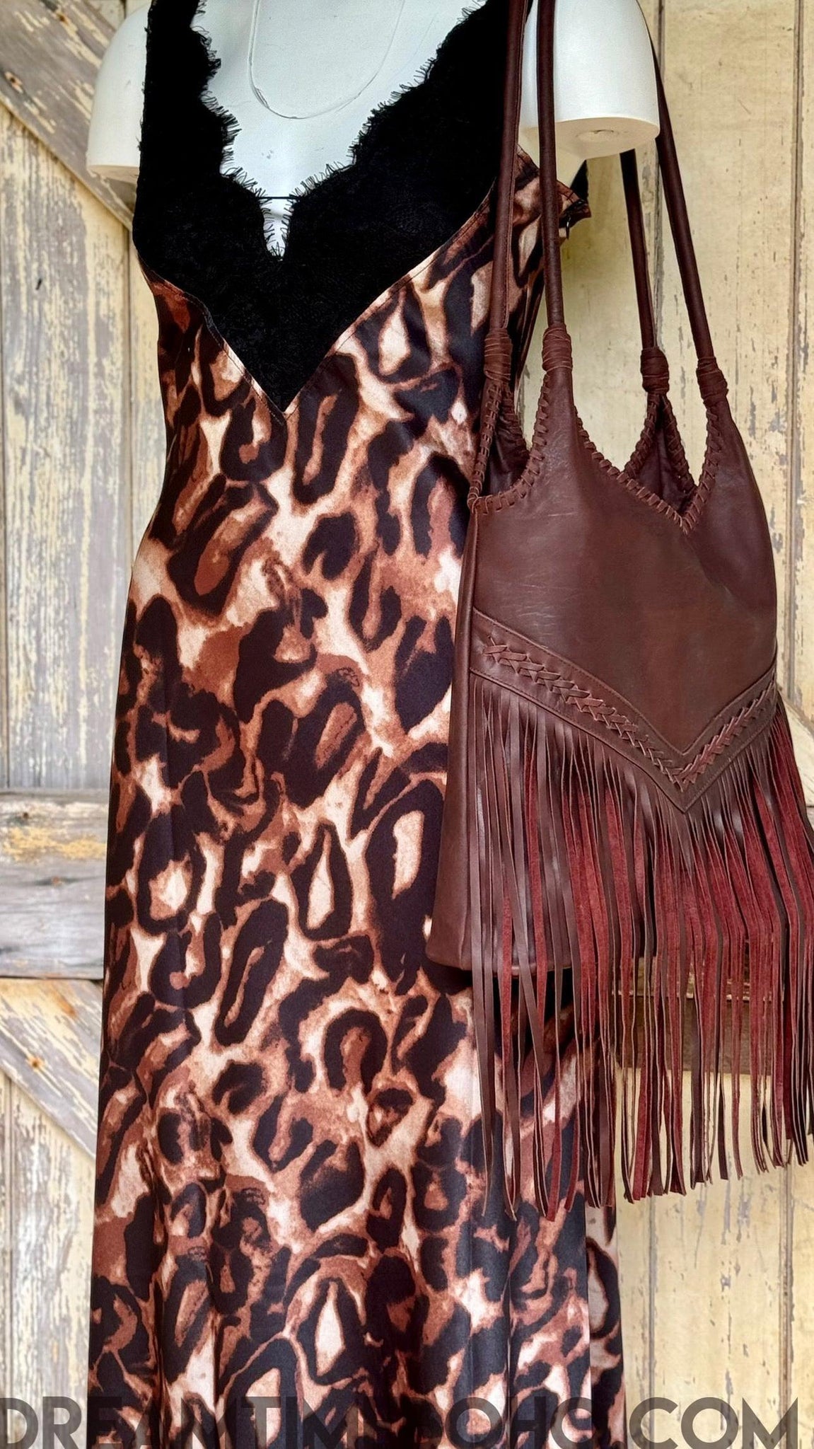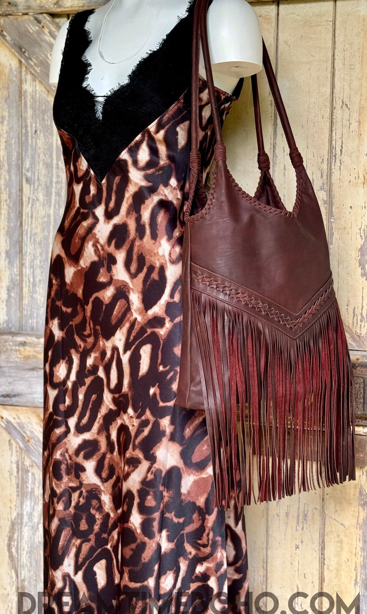 Chocolate brown leather fringe shoulder bag hanging display, handcrafted boho style
