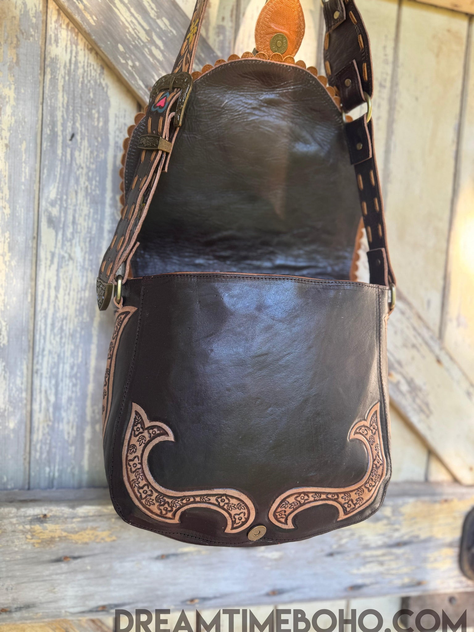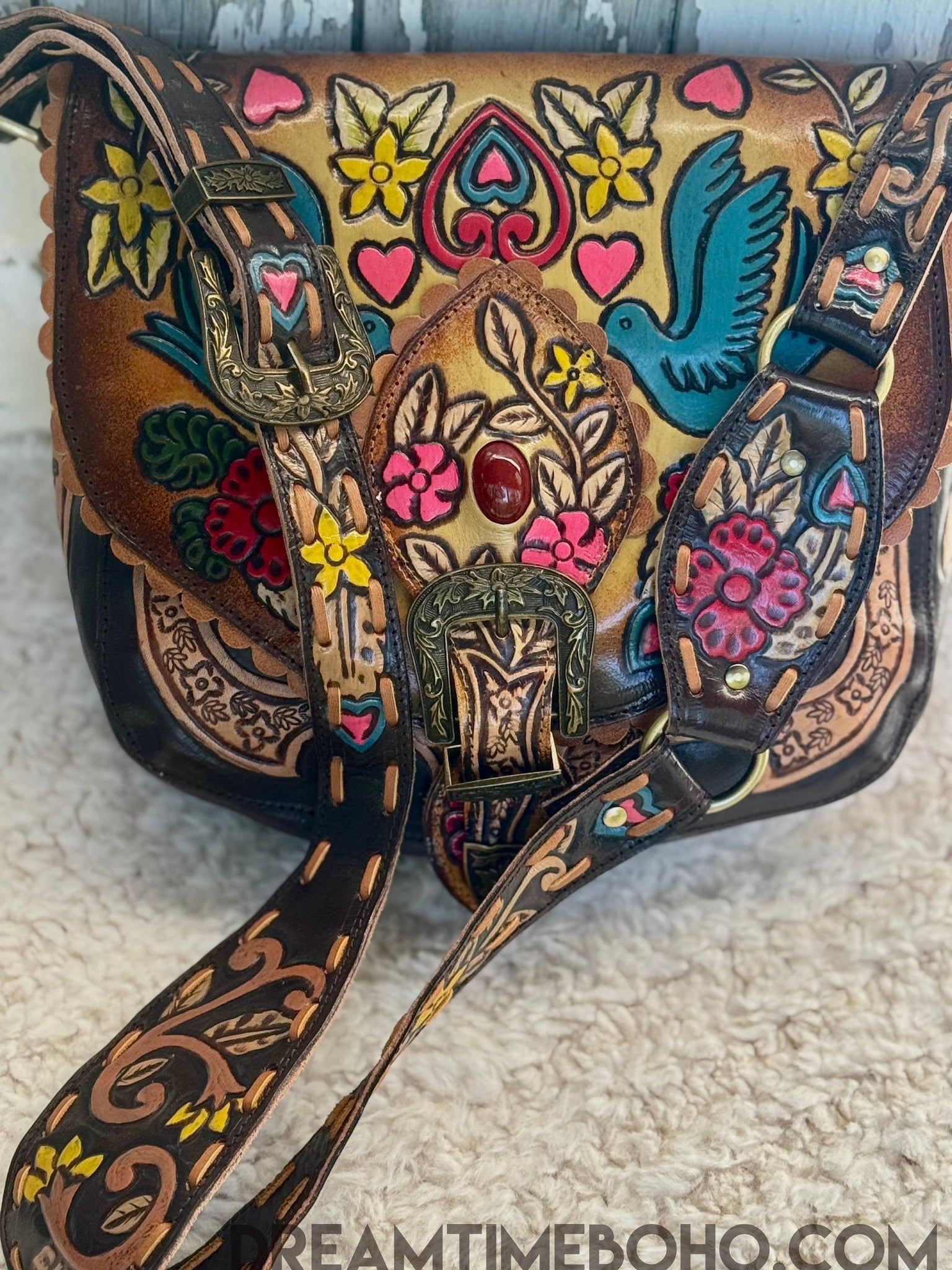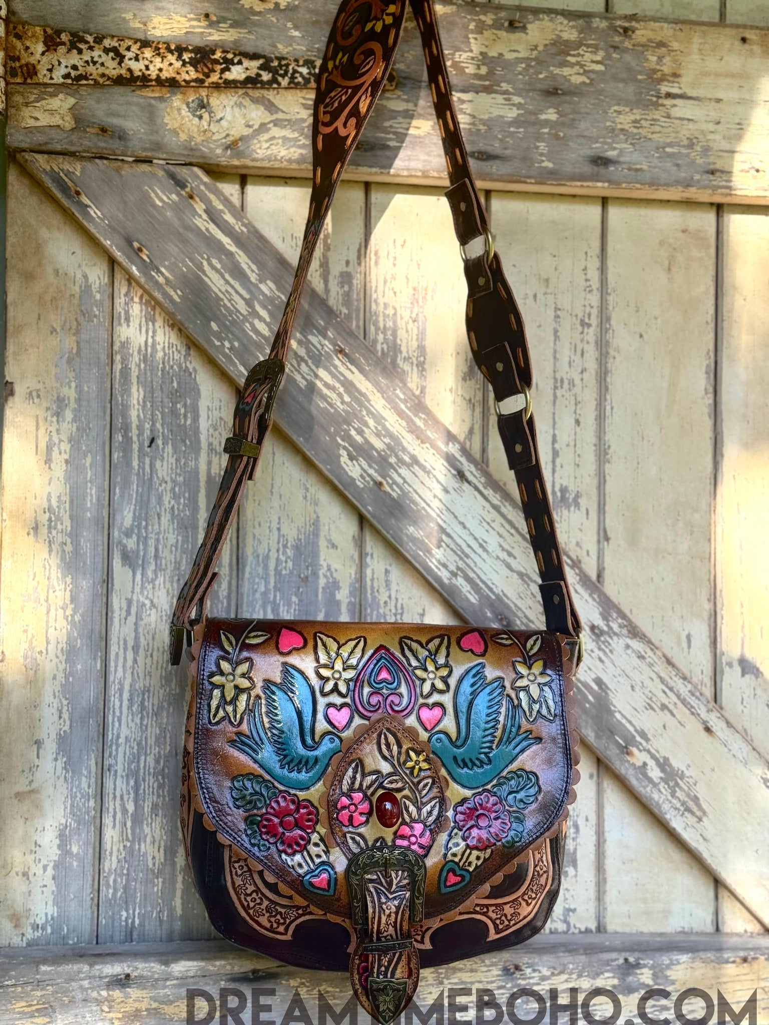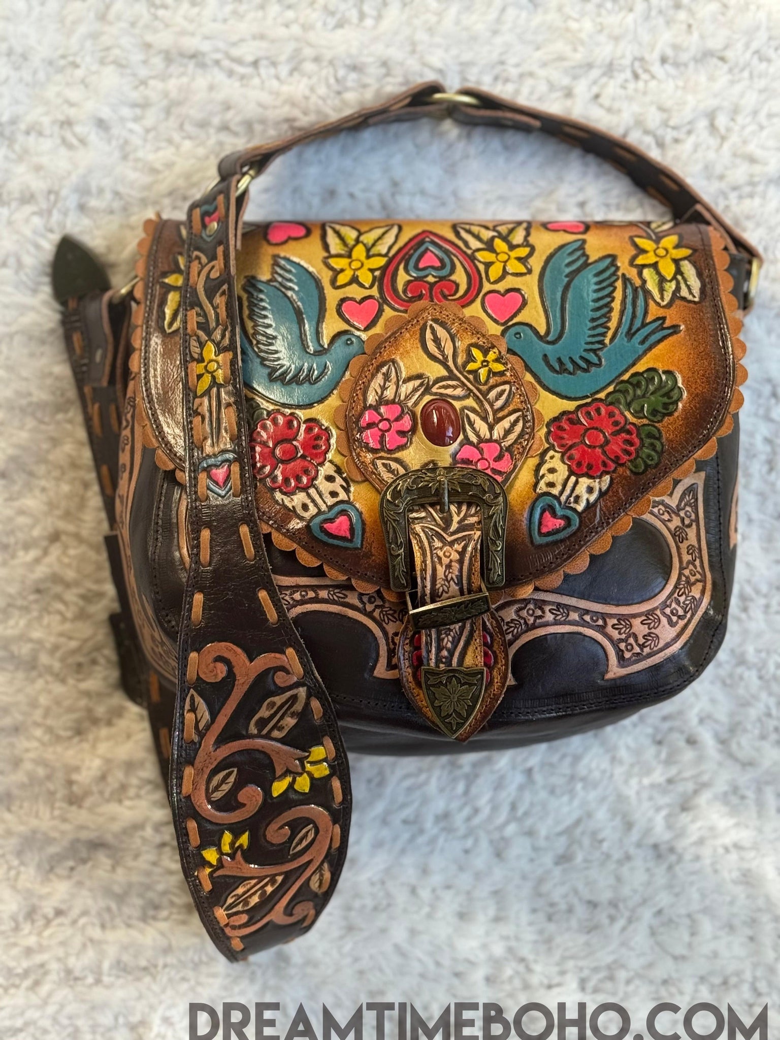 Our Luxe Love Story Fringe Free Boho Bag embodies the artistry and soul of handcrafted leatherwork. Hours of meticulous craftsmanship have gone into every detail, from the intricate hand tooled designs to the vibrant, hand painted motifs that evoke a sense of love, freedom, and nature. With striking colors and charming details like the twin bluebirds, blooming flowers, and hearts, this bag is truly a wearable work of art. The sturdy, embellished buckle and adjustable strap ensure durability and style. Perfect for those who cherish unique, one of a kind accessories, this bag is more than just a carryall it’s a celebration of craftsmanship and bohemian spirit.