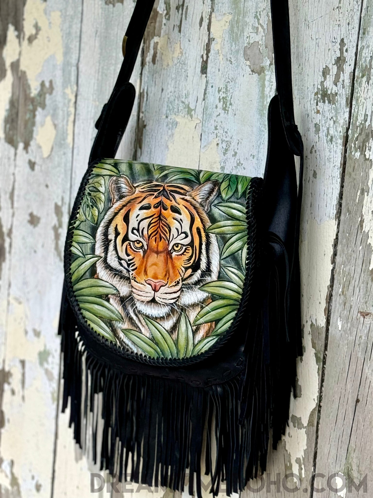 Introducing our stunning Hand-Painted Tiger Fringed Boho Leather Bag - where art meets craftsmanship. This one-of-a-kind piece features a breathtaking, hand-tooled design with a majestic tiger, beautifully painted to capture its fierce yet graceful presence. Surrounding the tiger are vibrant jungle leaves, blending into the natural beauty of the wild.