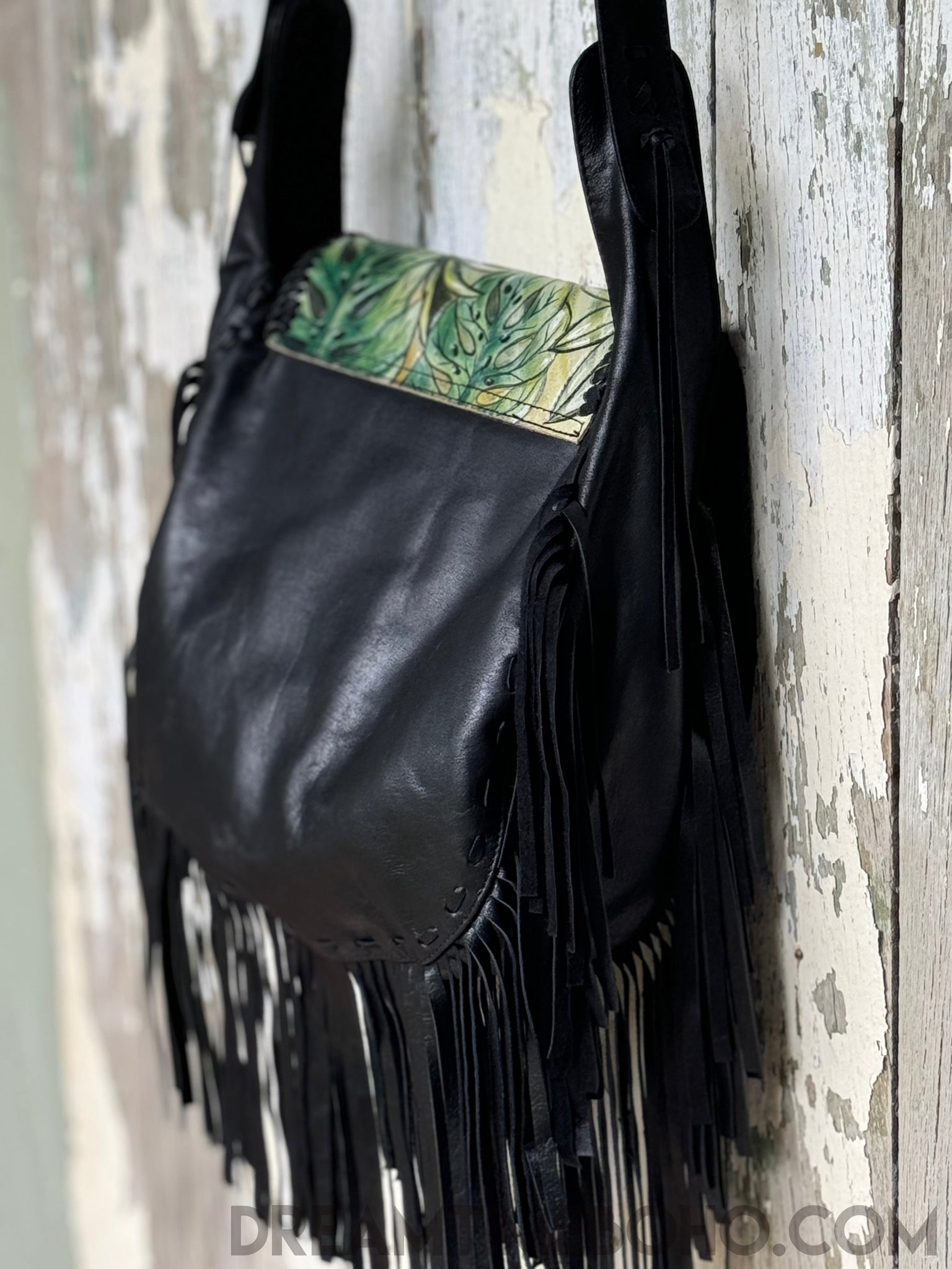 Made from premium, sustainably sourced leather, the bag is accented with long, luxurious fringe, embodying that perfect bohemian spirit. Each stroke of paint and every detail in the tooling is a tribute to traditional artistry, making this bag a wearable masterpiece.