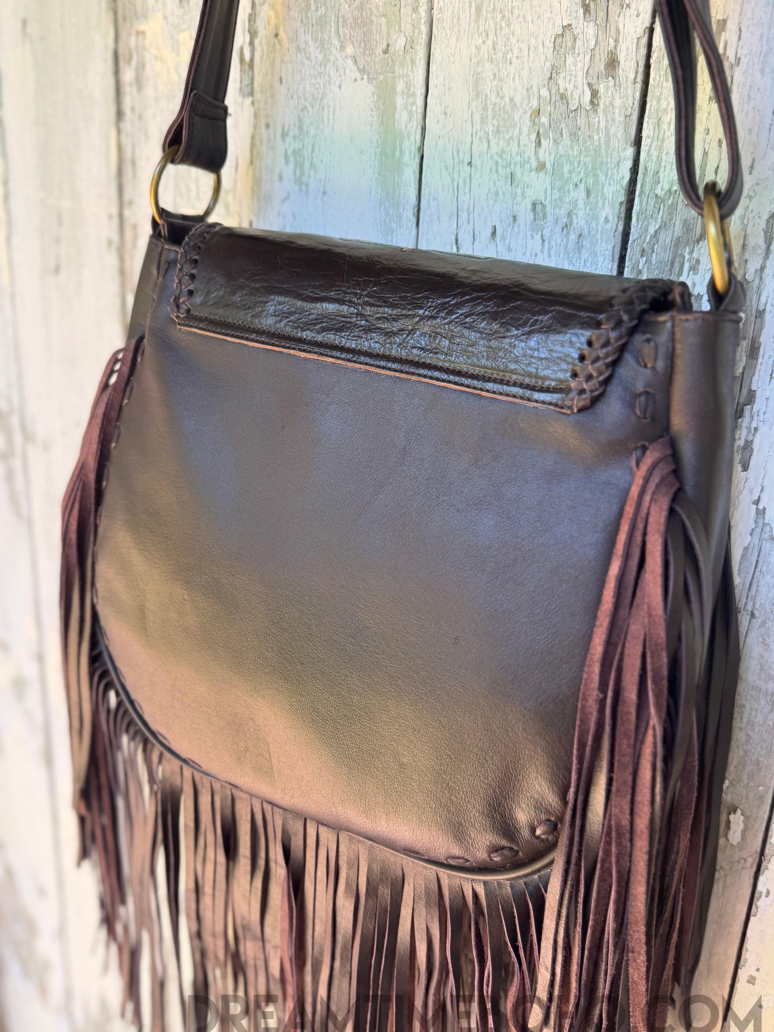 Crafted from soft, rich dark leather with long flowing fringe, this bag brings movement, mystery, and boho soul to every outfit. It’s practical too, roomy inside and designed for everyday wear.