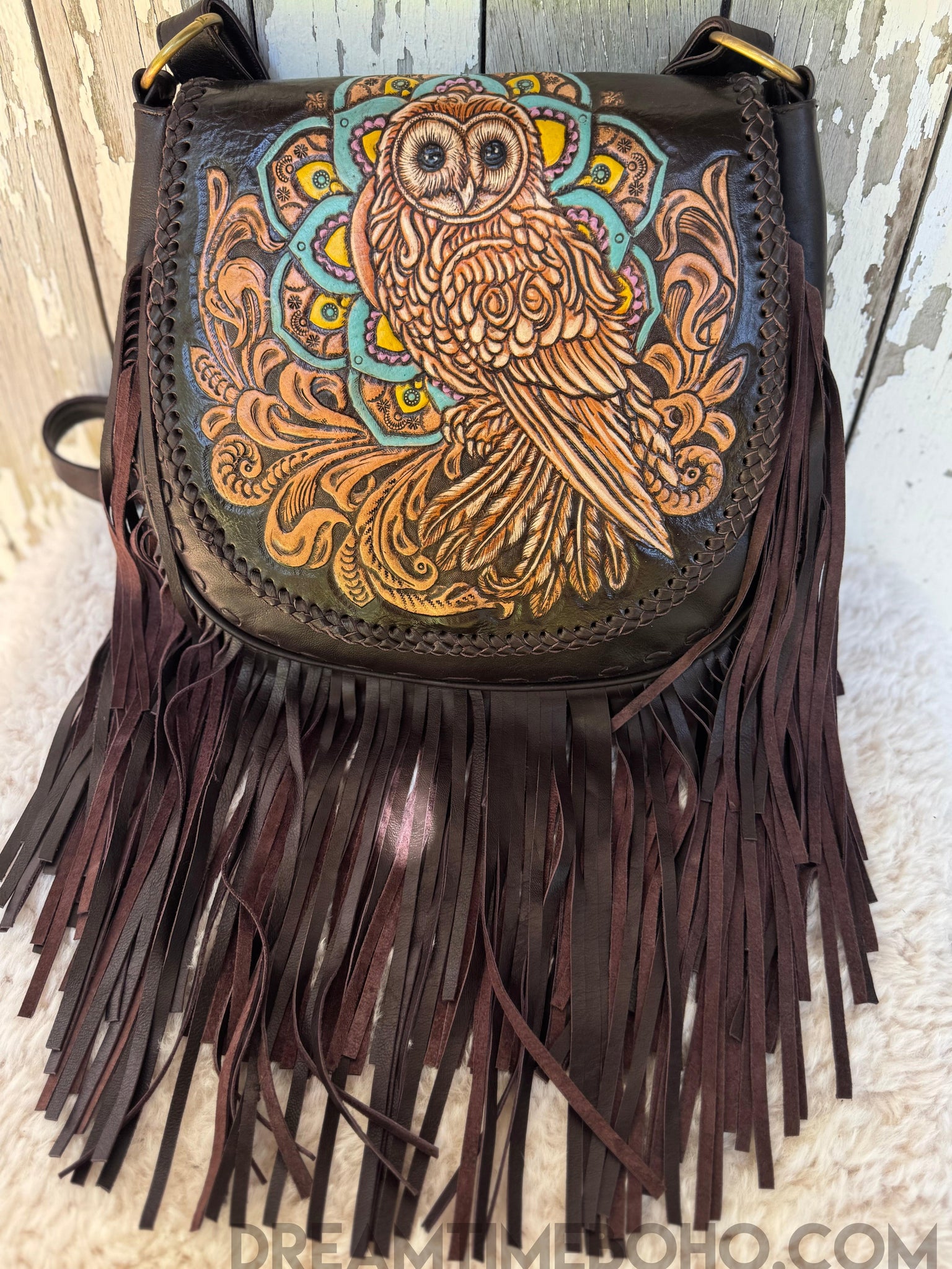 Meet your new spirit guide in leather form, the Night Guardian Hand Tooled Owl Leather Fringe Crossbody Bag.
