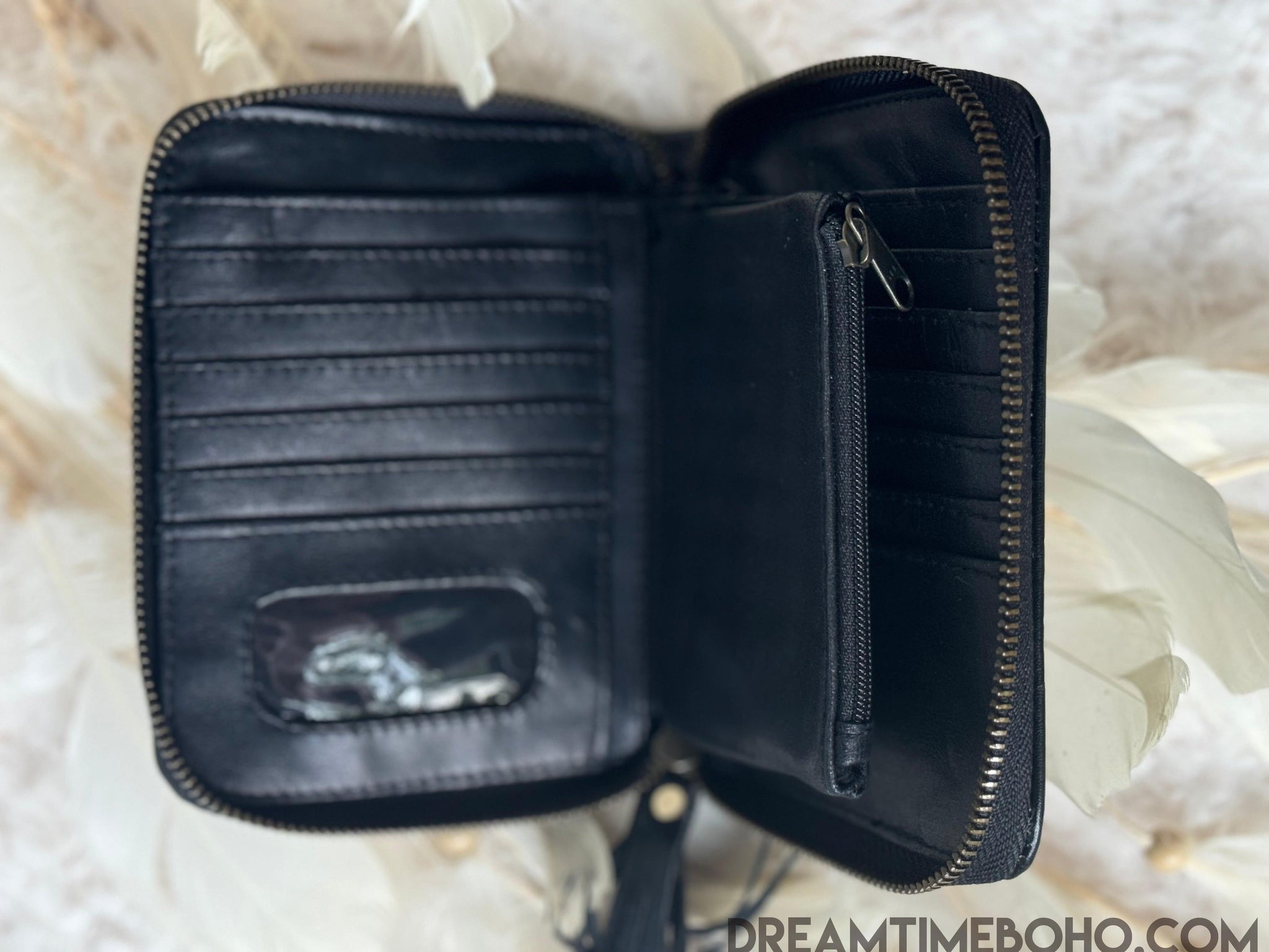 The wallet is finished with a sleek zip closure and a chic black leather tassel for a hint of boho flair. Ideal for everyday use or as a statement accessory for special occasions, this piece is both functional and fashionable a must have for any bohemian soul.