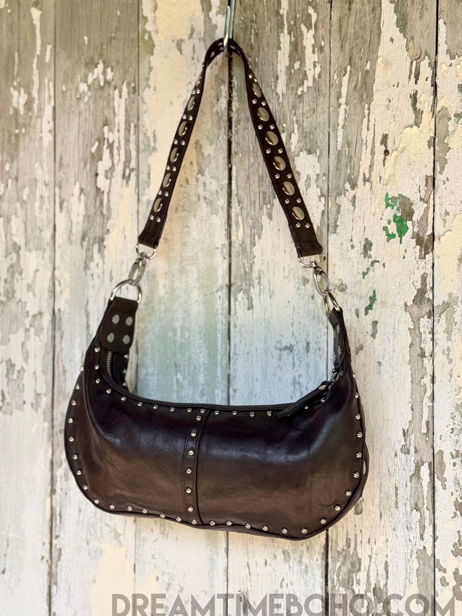 Turn heads with this chic leather studded shoulder bag — the perfect blend of edgy rockstar vibes and timeless boho charm. Crafted from soft, genuine leather in a luxe chocolate tone, this compact yet stylish bag is detailed with silver studs along the body and strap for a bold statement look. The wide strap studded accents adds comfort and uniqueness, making it your go to accessory for concerts, festivals, or everyday wear. Versatile and effortlessly cool, this bag brings just the right touch of attitude to any outfit.