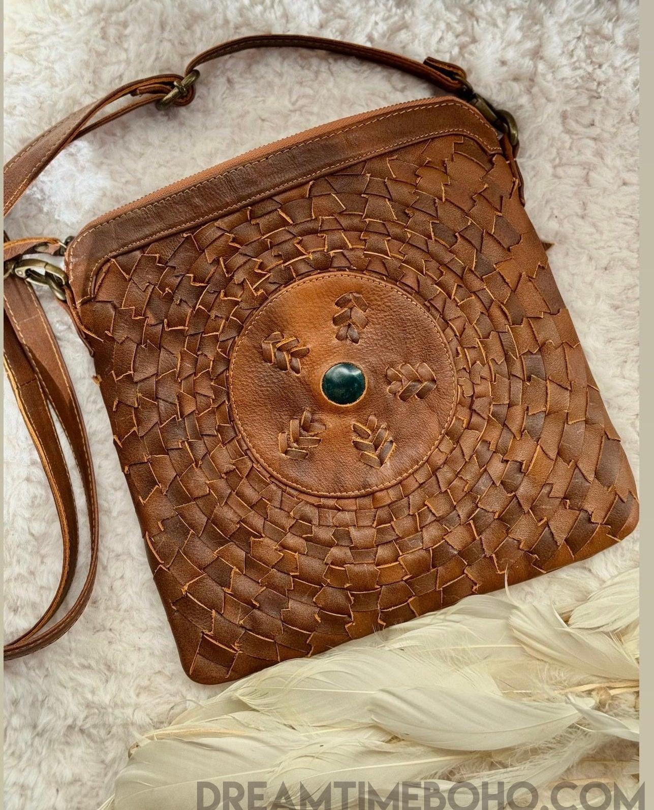 Elevate your bohemian style with our Handmade Genuine Leather Boho Crossbody Bag, beautifully crafted for free spirits and lovers of artisan fashion. Made from thick, durable, high quality leather, this unique bag features an intricately handwoven circular design and a central gemstone detail that radiates earthy, spiritual charm.